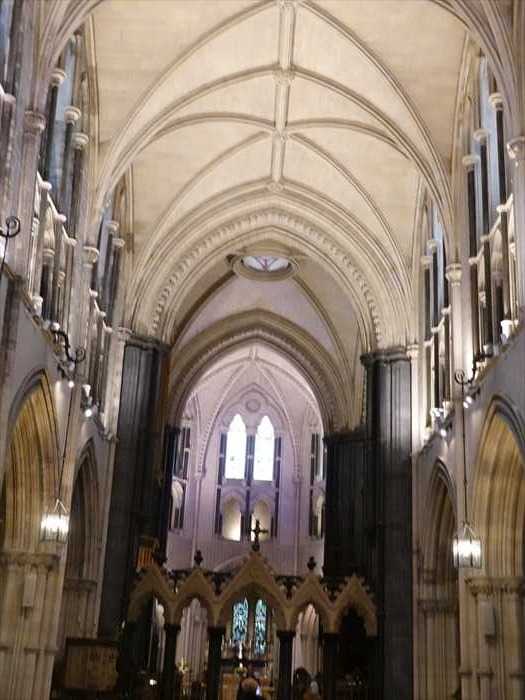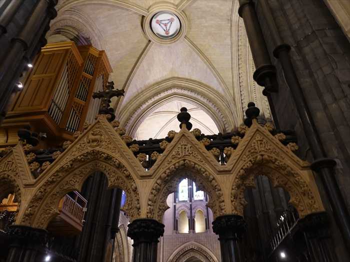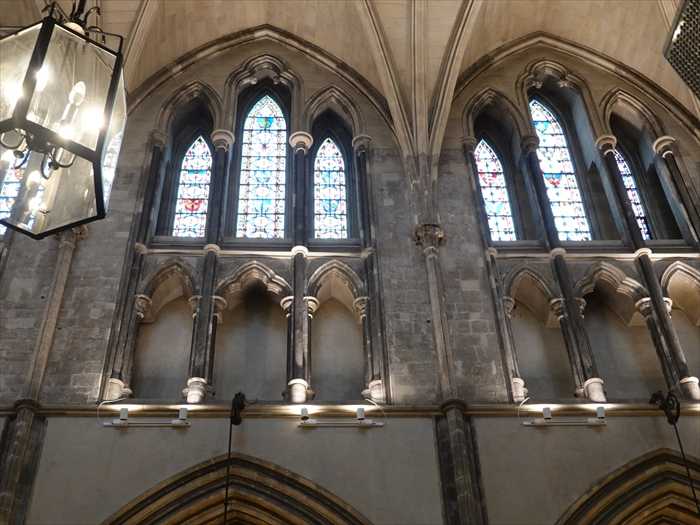・西正面(West Front)から東方向(内陣方向)を見た全景 。 ・西端の主入口付近から中央身廊(Nave)の中心軸に沿ってカメラを。 ・上部に見える5連の尖頭アーチ窓が「西正面大窓(Great West Window)」で、外部からもよく 見える特徴的なファサード要素。