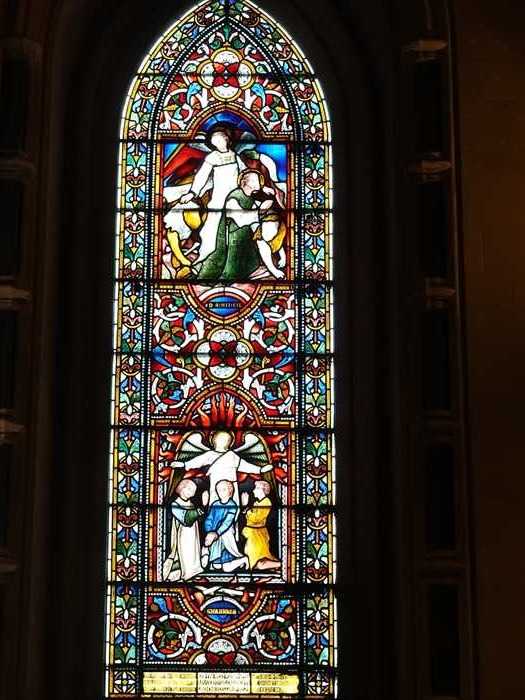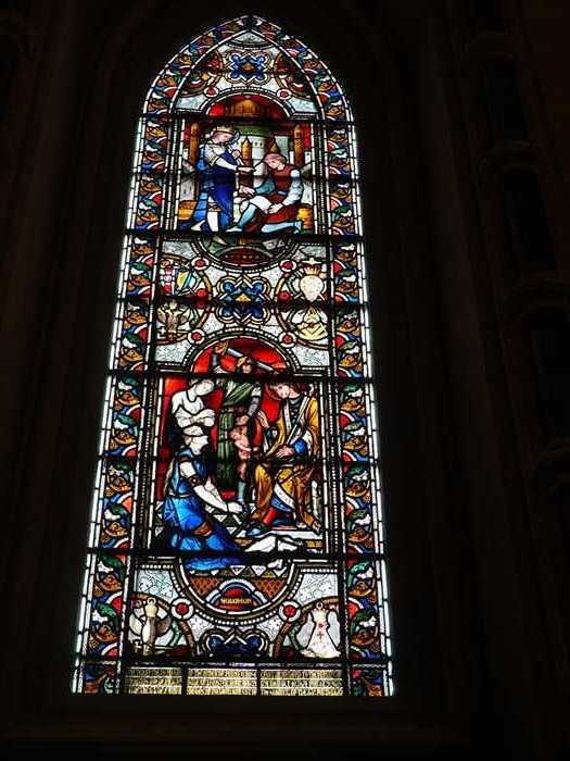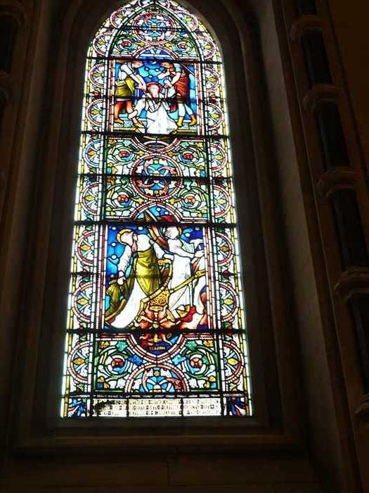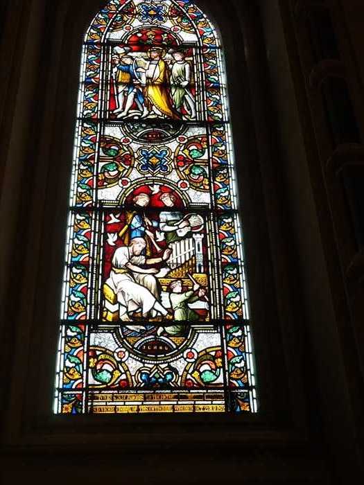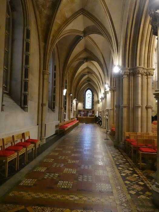 ・右奥の明るい部分は南側の西端(南玄関)方向。 ・左に見える細長い縦窓は、外壁上部に並ぶ高窓(クリアストーリー窓)で、下部は ベンチが設置された壁面。 ・奥(西端)の壁中央に縦長のステンドグラスが1枚。 この窓は「南西端窓(West end of South Aisle)」にあたる。 ・色タイルによる幾何学模様が中央に伸び、左右に石列・ベンチが並んでいた。 ・天井は、交差リブ・ヴォールトが側廊の全長にわたって連続していた。