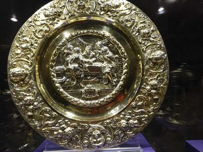 The large alms dish in the centre of the case shows the Supper at Emmaus, when Jesus, who had risen from the dead, appeared to two of his followers at dinner in the town of Emmaus.