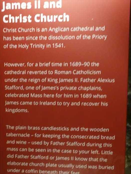 However, for a brief time in 1689–90 the cathedral reverted to Roman Catholicism under the reign of King James II. Father Alexius Stafford, one of James’s private chaplains, celebrated Mass here for him in 1689 when James came to Ireland to try and recover his kingdoms.