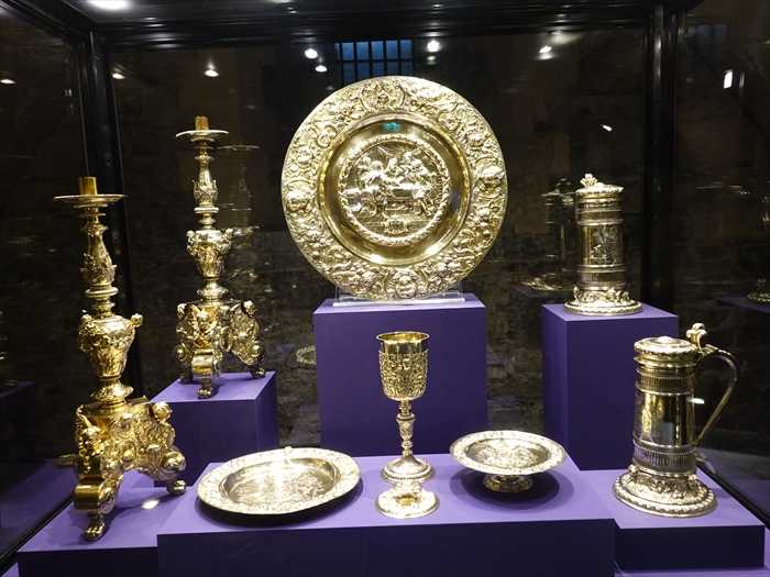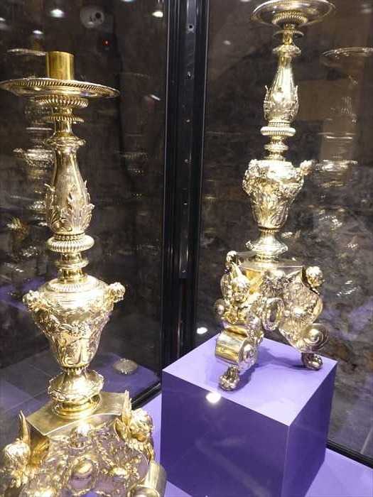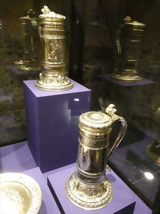 The beautiful collection of silver-gilt altar plate in the case to your left was commissioned by King William III for use in his royal chapel in Dublin. It was made by the London goldsmith, Francis Garthorne.