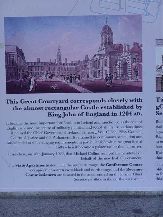 It became the most important fortification in Ireland and functioned as the seat of English rule and the centre of military, political and social affairs. At various times it housed the Chief Governors of Ireland, Treasury, War Office, Privy Council, Courts of Justice and the Parliament. It remained in continuous occupation and was adapted to suit changing requirements, in particular following the great fire of 1684 when it became a palace rather than a fortress. It was here, on 16th January 1922, that Michael Collins received the handover on behalf of the new Irish Government.」