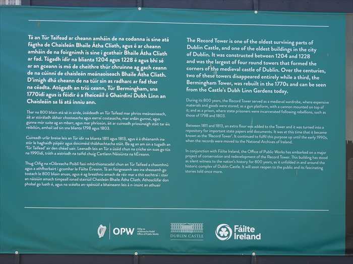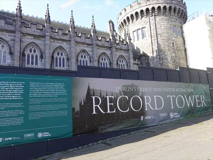 「The Record Tower is one of the oldest surviving parts of Dublin Castle, and one of the oldest buildings in the city of Dublin. It was constructed between and 1228 and was the largest of four round towers that formed the corners of the medieval castle of Dublin. Over the centuries, two of these towers disappeared entirely while a third, the Bermingham Tower, was rebuilt in the 1770s andcan be seen from the Castle’s Dubh Linn Gardens today.