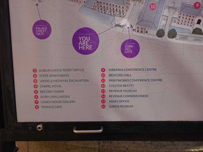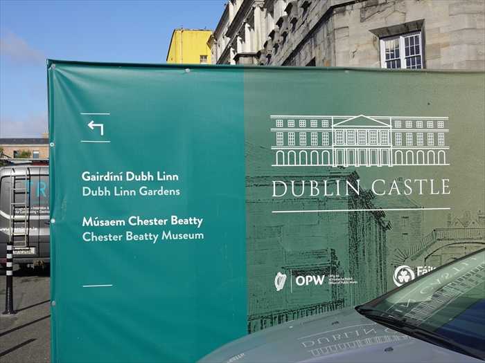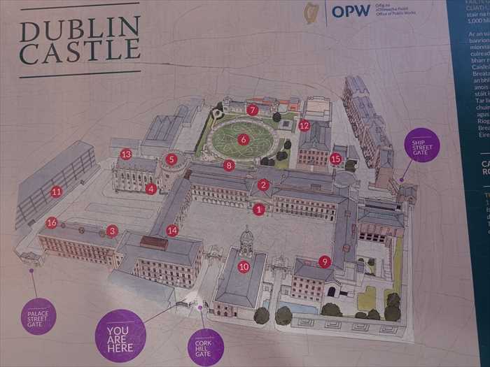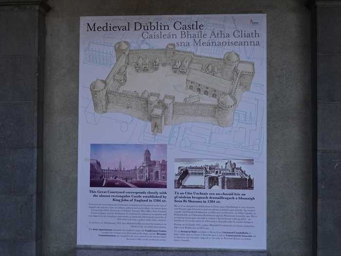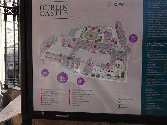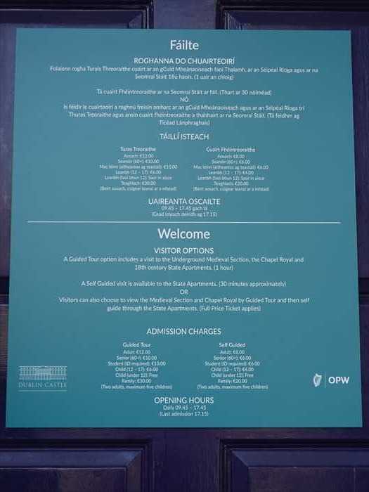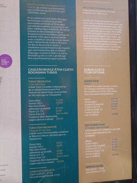 この案内板は、ダブリン城(Dublin Castle)の見学ツアーに関する情報、料金を示していた。 「WELCOME TO DUBLIN CASTLE,