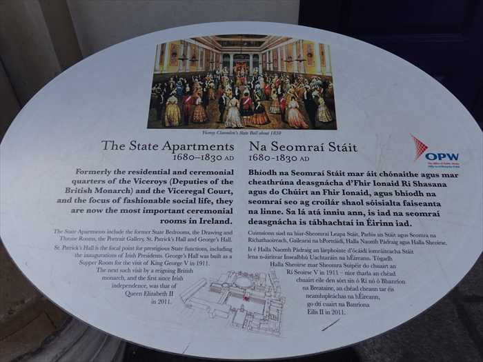 「The State Apartments 1680–1830 AD Formerly the residential and ceremonial quarters of the Viceroys (Deputies of the British Monarch) and the Viceregal Court, and the focus of fashionable social life, they are now the most important ceremonial rooms in Ireland. The State Apartments include the former State Bedrooms, the Drawing and Throne Rooms, the Portrait Gallery, St. Patrick’s Hall and George’s Hall. St. Patrick’s Hall, the venue for prestigious State functions, including the inauguration of the Irish President, was last used for such by British monarchs in 1911.Upon her first state visit to Ireland, Queen Elizabeth II spoke in St. Patrick’s Hall in 2011.」