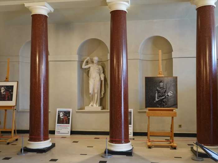 中央の赤い円柱と左右の壁龕(ニッチ)に展示物が配置され、クラシックな建築装飾と
