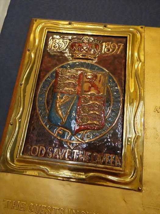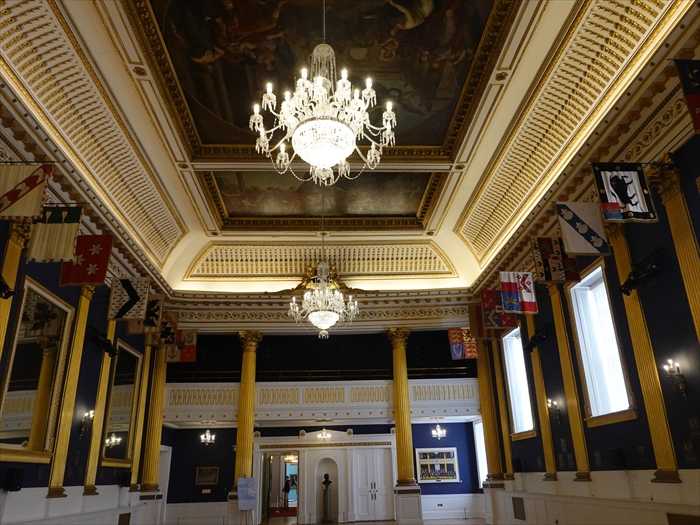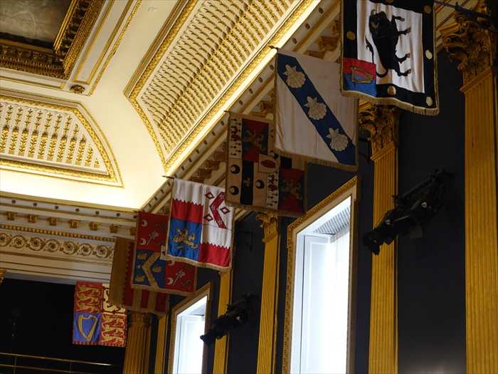 ホールの奥の壇上には、かつてイギリス国王・王妃・プリンス・オブ・ウェールズを象徴する