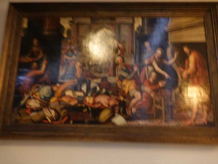 ・背景の奥の建築空間に、イエスがマルタとマリアに語りかけている場面が小さく描かれている。