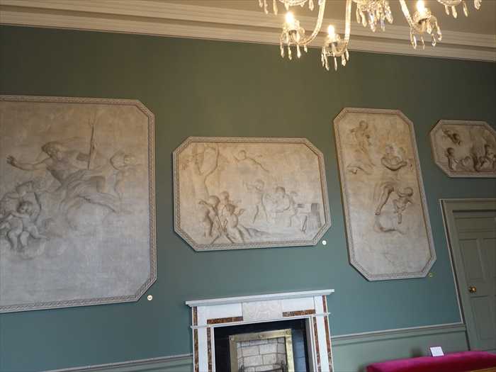 暖炉の上と両脇に配置されたレリーフが。