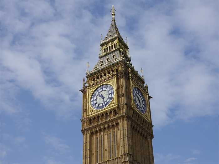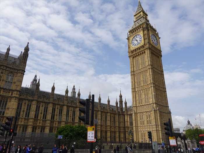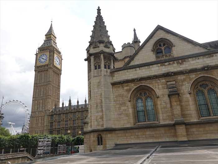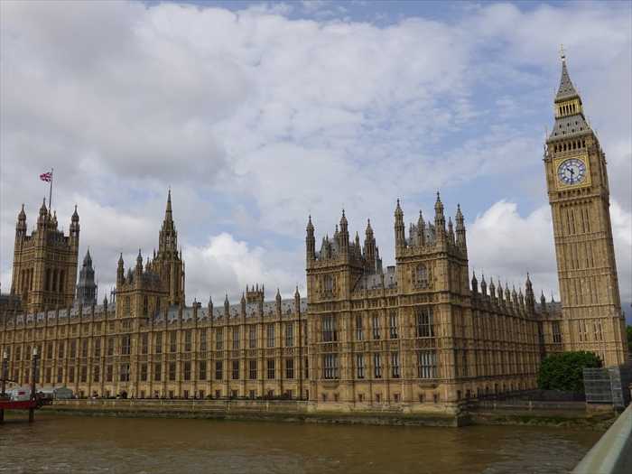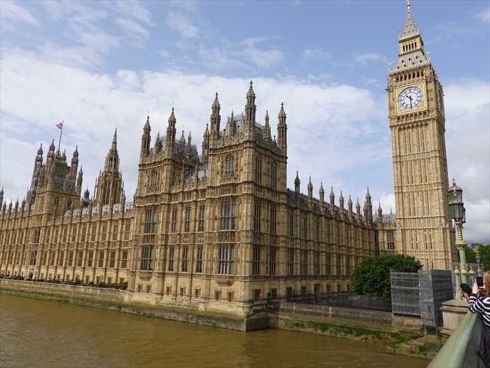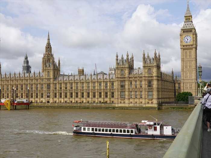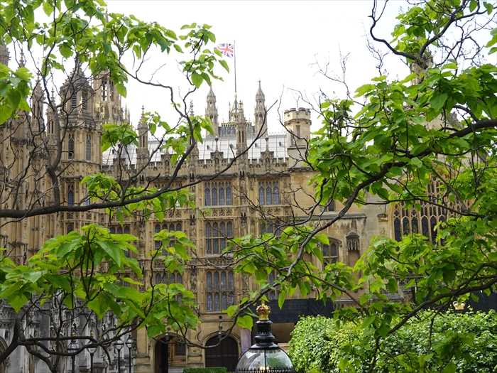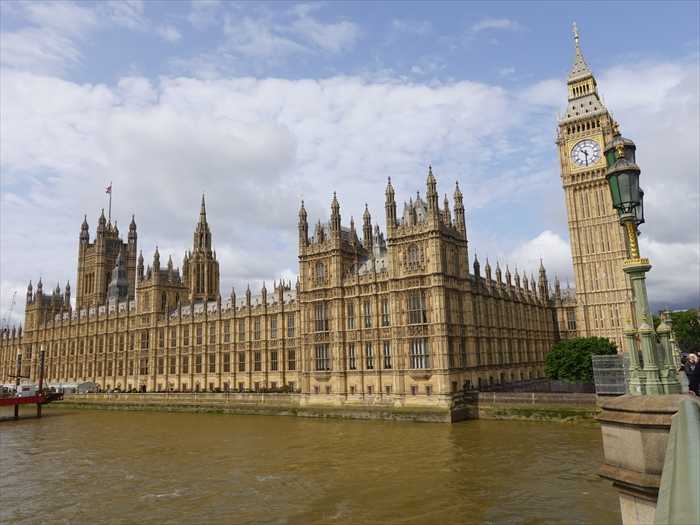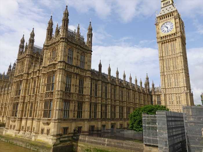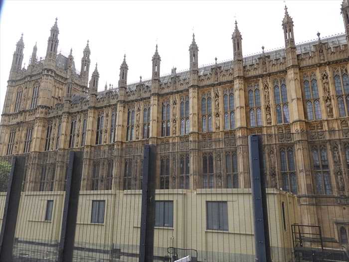 ウェストミンスター宮殿(Palace of Westminster, 英国国会議事堂)のリバーサイド・ ファサード(川沿いの外壁)。