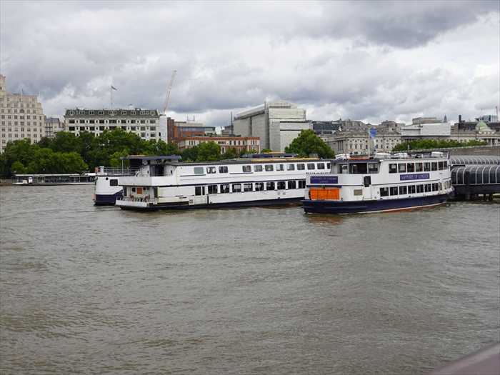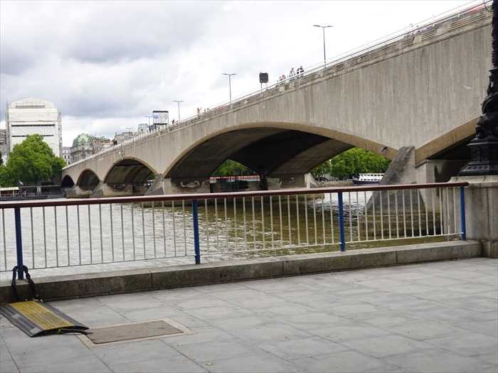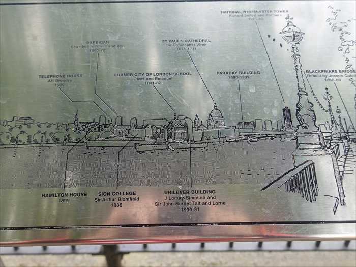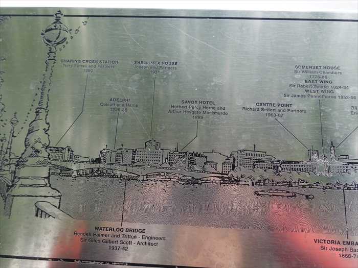 ロンドン・ウォータールー橋(Waterloo Bridge)から見たテムズ川北岸の建物案内プレート