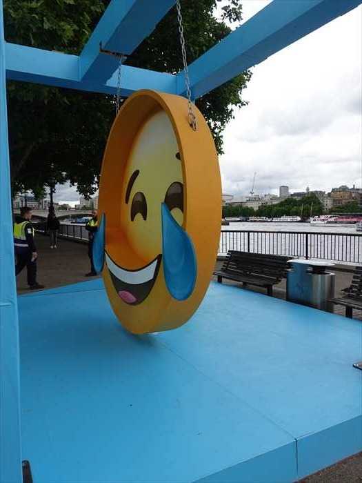 ・巨大な 「😂(涙を流して笑う顔)」の絵文字 が立体化され、厚みのある円盤状の造形に