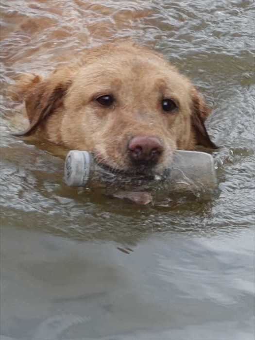 テムズ川で泳ぎながらボトルをくわえて。