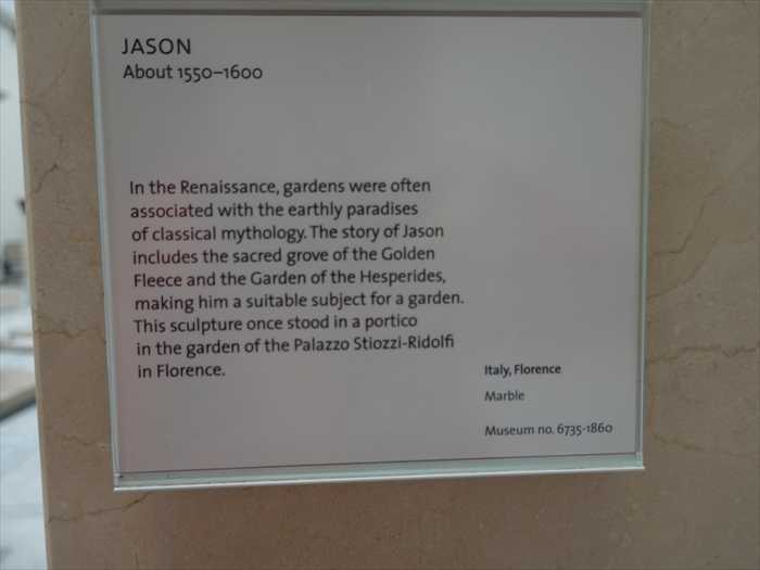 「JASON About 1550–1600 In the Renaissance, gardens were often associated with the earthly paradises of classical mythology. The story of Jason includes the sacred grove of the Golden Fleece and the Garden of the Hesperides, making him a suitable subject for a garden. This sculpture once stood in a portico in the garden of the Palazzo Stiozzi-Ridolfi in Florence.