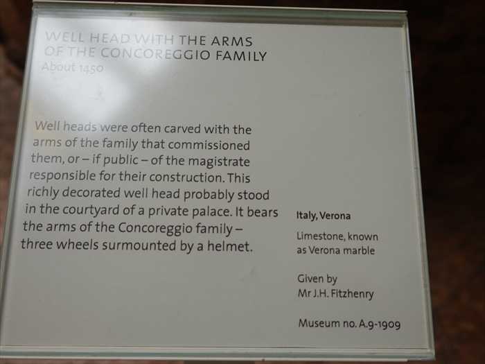 「WELL HEAD WITH THE ARMS OF THE CONCOREGGIO FAMILYWell heads were often carved with the arms of the family that commissioned them, or – if public – of the magistrate responsible for their construction. This richly decorated well head probably stood in the courtyard of a private palace. It bears the arms of the Concogreggio family – three wheels surmounted by a helmet. Italy, VeronaLimestone, known as Verona marbleGiven by Mr J.H. FitzhenryMuseum no. A.9-1909」