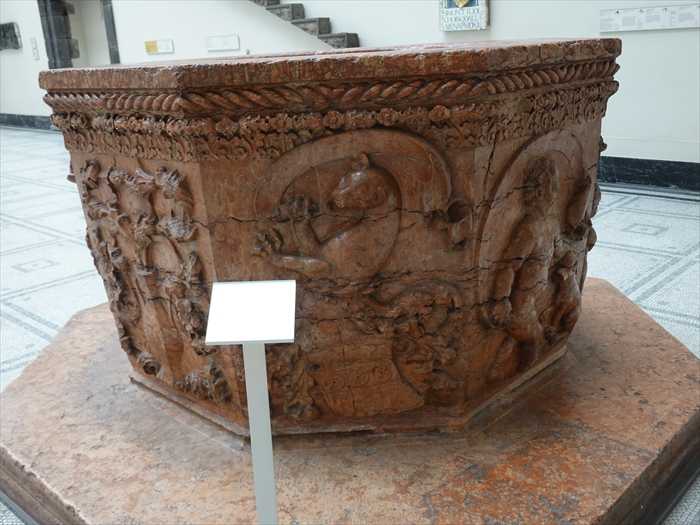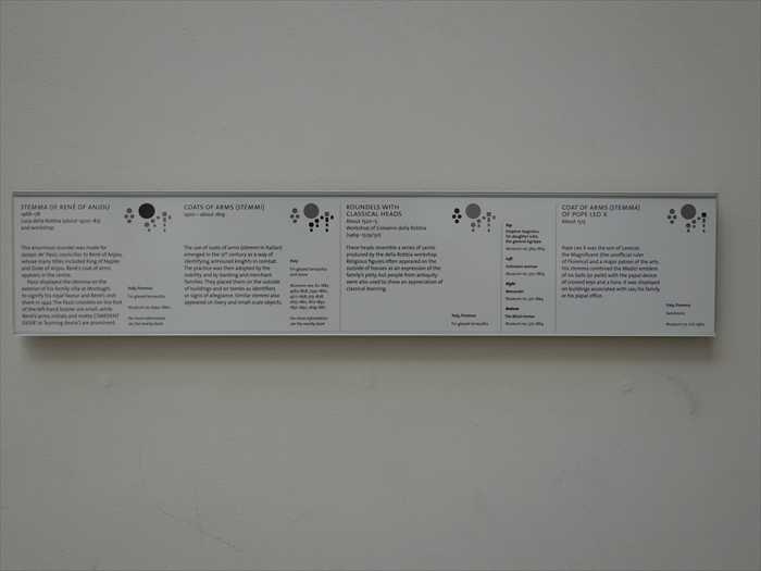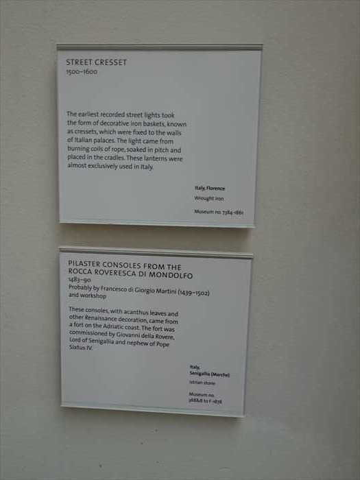 下のプレート。 「PILASTER CONSOLES FROM THE ROCCA ROVESCAS DI MONDOLFO 1462–1480 Probably by Francesco di Giorgio Martini (1439–1502) and workshop These consoles,with acanthus leaves and other Renaissance decoration, came from a fort on theAdriatic coast. The fort was commissioned by Giovanni della Rovere, Duke of Sora,Lord of Senigallia and nephew of Pope Sixtus IV. Italy, Senigallia(Marche) Verona marble