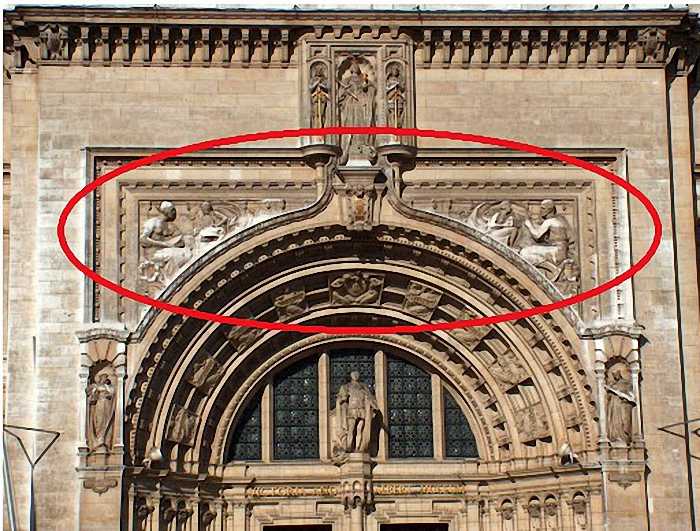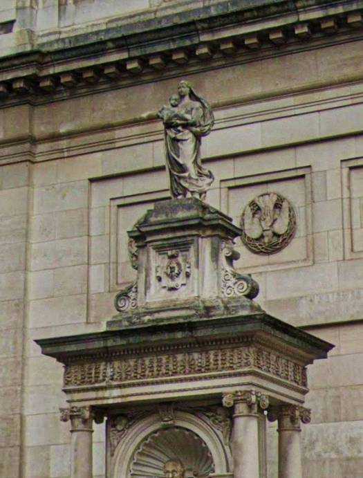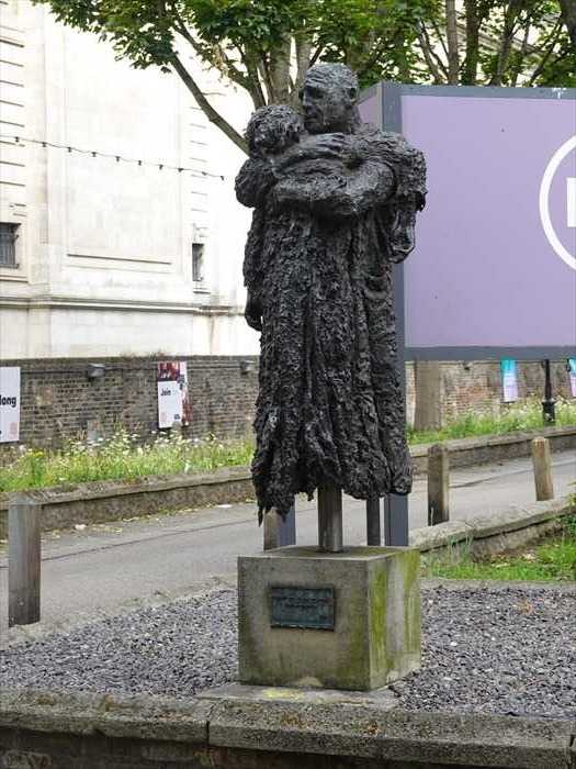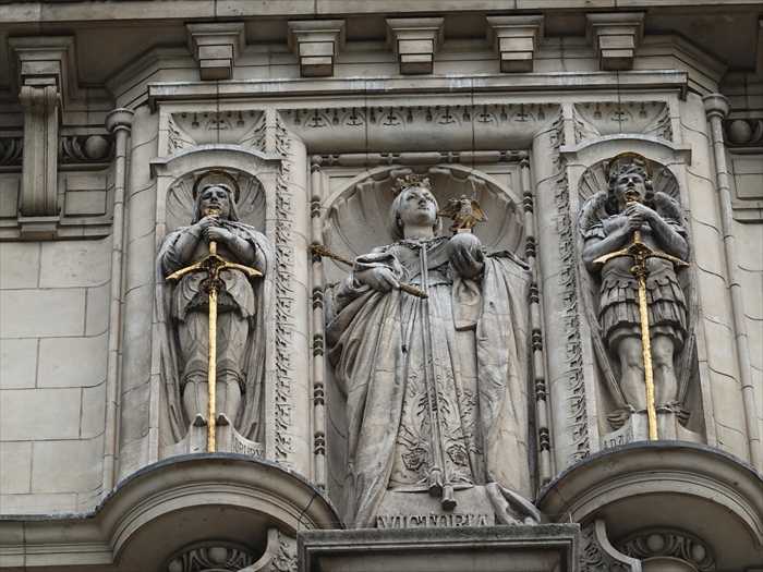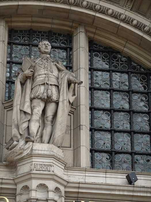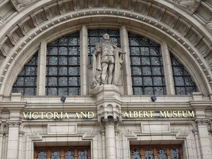 Victoria and Albert Museum・ヴィクトリア&アルバート博物館入口前から見上げて。 ・正面中央の大アーチ(ポーチ)は「ポータル」と呼ばれ、細かい彫刻が施されている。 ・上部には塔のようなクイーン・メアリー・タワー(Queen Mary’s Tower)がそびえる。 ・ファサードにはヴィクトリア時代の彫刻や装飾モチーフが豊かにあしらわれ、19世紀末の 折衷主義的なデザインを代表している。