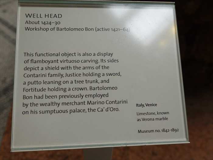 「WELL HEADAbout 1424–30Workshop of Bartolomeo Bon (active 1421–64) This functional object is also a display of flamboyant virtuoso carving. Its sides depict a shield with the arms of the Contarini family, Justice holding a sword, a putto leaningon a tree trunk, and Fortitude holding a crown. Bartolomeo Bon had been previously employed by the wealthy merchant Marino Contarini on his sumptuous palace ,the Ca’ d’Oro. Italy, VeniceLimestone, known as Verona marbleMuseum no. 1842-1892」
