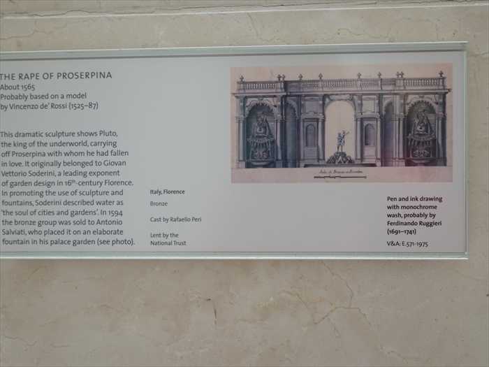 This dramatic sculpture shows Pluto, the king of the underworld, carrying off Proserpina with whom he had fallen in love. It originally belonged to Giovan Vittorio Soderini, a leading exponent of garden design in 16th-century Florence. In promoting the use of sculpture and fountains, Soderini described water as the soul of cities and gardens. In 1594 the bronze group was sold to Antonio Salviati, who placed it on an elaborate fountain in his palace garden (see photo).Italy, FlorenceBronze Cast by Raffaello PeriLent by the National TrustPen and ink drawing with monochrome wash, probably by Ferdinando Ruggieri (1691–1741)V&A: E.571-1975」
