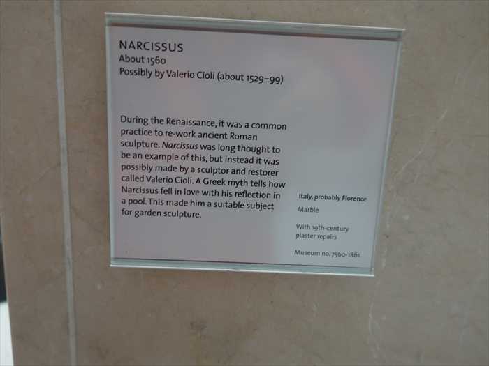 During the Renaissance, it was a common practice to re-work ancient Roman sculpture. Narcissus was long thought to be an example of this, but instead it was possibly made by a sculptor and restorer called Valerio Cioli. A Greek myth tells how Narcissus fell in love with his reflection in a pool. This made him a suitable subject for garden sculpture.Italy, probably Florence