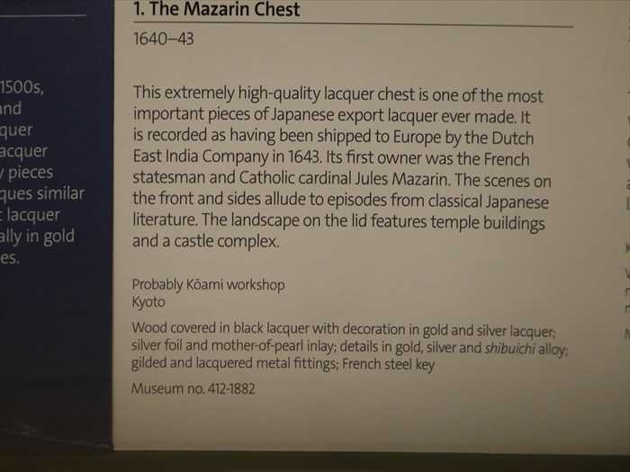 This extremely high-quality lacquer chest is one of the most important pieces of Japanese export lacquer ever made. It is recorded as having been shipped toEurope by the Dutch East India Company in 1643. Its first owner was the French statesman and Catholic cardinal Jules Mazarin. The scenes on the front and sides allude to episodes from classical Japanese literature. The landscape on the lid featurestemple buildings and a castle complex.