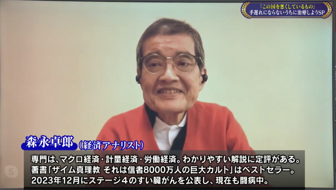 ついこの前、日曜日の、そこまで言って委員会NPで、リモートで、財務省に関して、お話されていたのに、、、収録だろうけど、フジテレビの会見とかの話も出てたので、先週とかだと思うが。。かなり、瘦せられて、大丈夫だろうか。。。という感じであったけど黒木委員長も、最後に、お身体に気を付けてと言われてたが。。。あのコレクションは、どうされるのか。。。このまま、博物館は継続いただきたいけどご冥福を、お祈りいたします。森永卓郎さん 死去 67歳 原発不明がんのため きょう自宅で 長男・康平さん「闘病中は本当に多くの方から応援のメッセージをいただき、本人だけでなく私たち家族も勇気づけられていました」1/28(火) 22:38配信経済アナリストの森永卓郎さんが、きょう自宅で亡くなったことが分かりました。67歳でした。葬儀は、近親者のみの家族葬にて執り行われるということです。長男の森永康平さんは「闘病中は本当に多くの方から応援のメッセージをいただき、本人だけでなく私たち家族も勇気づけられていました。ありがとうございます。」「まだ気持ちの整理が出来ていませんし、暫くは長男として母を支えつつ、様々な手続きなどの対応もしなくてはいけないのですが、時間が出来た段階で、余命宣告をされてから今日に至るまでの闘病の様子や、父の最期の様子なども、皆様にご報告させていただければと思います。それまでは温かく見守っていただけますと幸いです。」と、コメントを発表しています。前日の1月27日、ラジオ番組に出演した森永卓郎さんは「多分ですね、がんの宣告されて以降、最悪の状態なんですよ。今日、お医者さんが、家に来てくれることになってるんですけれども、どうやら、本格転移が始まっちゃったんじゃないかなと、いう感じで、ものすごく痛いんですね。浸潤してきたところが。」と、明かしていました。【 所属事務所の広報文より引用 】このたび、森永卓郎【67 歳】が、1 月 28 日(火)13 時 33 分、原発不明がんのため、自宅にて逝去いたしました。森永は 2023 年末にがんが判明。その後、闘病生活を続けるなかでも、経済アナリストとして精力的に発信を行ってまいりました。生前最後の生放送の出演は 1 月 27 日(月)放送「大竹まこと ゴールデンラジオ!(文化放送)となりました。ファンの皆様、関係者の皆様には、生前のご厚誼、ご厚情を賜り、深く感謝するとともに、謹んでお報せいたします。なお、葬儀は、近親者のみの家族葬にて執り行われます。誠に勝手ながら、香典、供花、供物等は、謹んでご辞退申し上げます。マスコミの皆さまにおかれましては、深い悲しみの渦中にいらっしゃるご親族へご配慮頂きますよう、切にお願い申し上げます。以下、長男・森永康平氏(経済アナリスト)のコメントとなります。父は 2023 年 11 月に癌の告知を受け、同時に余命宣告をされて以降、仕事をしながら闘病してきましたが、本日息を引き取りました。闘病中は本当に多くの方から応援のメッセージをいただき、本人だけでなく私たち家族も勇気づけられていました。ありがとうございます。余命宣告を受けてから、父は病状や体調、治療状況などについて、可能な限り皆様に共有しようとしていました。まだ気持ちの整理が出来ていませんし、暫くは長男として母を支えつつ、様々な手続きなどの対応もしなくてはいけないのですが、時間が出来た段階で、余命宣告をされてから今日に至るまでの闘病の様子や、父の最期の様子なども、皆様にご報告させていただければと思います。それまでは温かく見守っていただけますと幸いです。森永康平****************************森永卓郎さんは2023年12月27日に「すい臓がん(ステージ4)」の診断を医師から受けたことを明らかにしていました。しかし、その後「原発不明がん」とされ、免疫療法薬による治療を行っていることを、後日、明かしていました。また、2024年11月4日に出演したイベントで、森永さんは、現在『要介護3』だと明かし、実際の生活について辛いことなどを聞かれると、”医者はもう部屋から外に出れない状態だというんですけども、普通にラジオの収録にも行っているし…”と変わらない生活だと告白。”8月は、本を1か月間13冊書くのに31日間完徹を続ける人体実験をやってセーフでした”と、驚きの発言をし、周りの出演者からは、どよめきの声が上がっていました。2025年1月15日の放送で、森永卓郎さんは「先週の金曜日に、血液検査を受けたんですね。そしたら、CA19-9っていう、腫瘍マーカーが、これ正常値の上限が、『36』ぐらいかな。それが『4100』もあって。100倍以上」「お腹とか背中の、中心部の周りが、激痛が走るようになって」「筋力が落ちて、スイスイ歩けない」「この1年で、一番状態が悪い」と、体調が悪化したことを明かしていました。更に、2025年1月16日の放送で、森永卓郎さんは、CTでの検査の結果「腹部に播種っていう、がんのとびひみたいなのがあるんですけど、そ