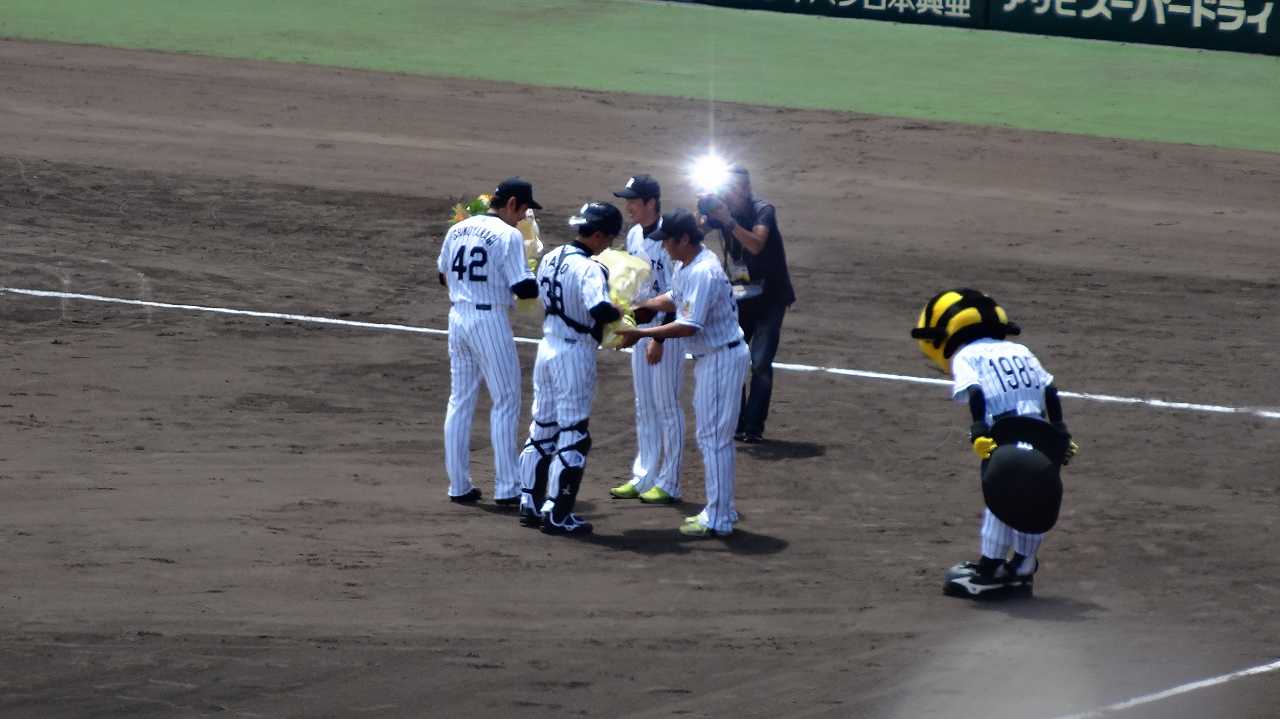 ストライク投球で、拍手喝采を浴びた下柳氏は「(矢野の)構えたところに(ボールは)いったけど、もう少し練習をしていたら130キロは出せたかな。このままベンチにいきたいぐらい」とジョークで笑わせた。矢野氏は「タイガースのユニホームを着て、こういうイベントをやらせてもらえてうれしかった。(ファンが)昔を思い出して喜んでくれたらうれしいですね」と話した。