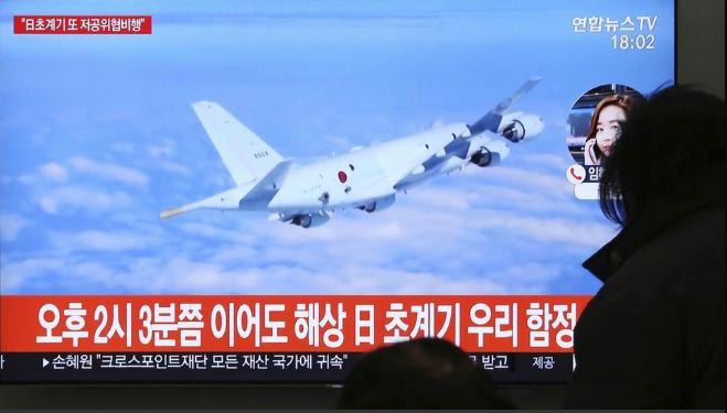 韓国・ソウル駅で日本の哨戒機に関するニュースを見る人々=23日(AP)