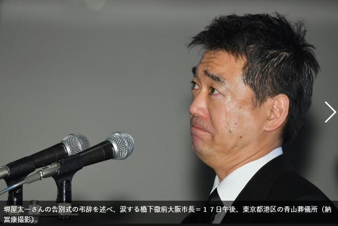堺屋太一さんの告別式の弔辞を述べ、涙する橋下徹前大阪市長 右は喪主の池口史子さん=17日午後、東京都港区の青山葬儀所(撮影・納冨康)