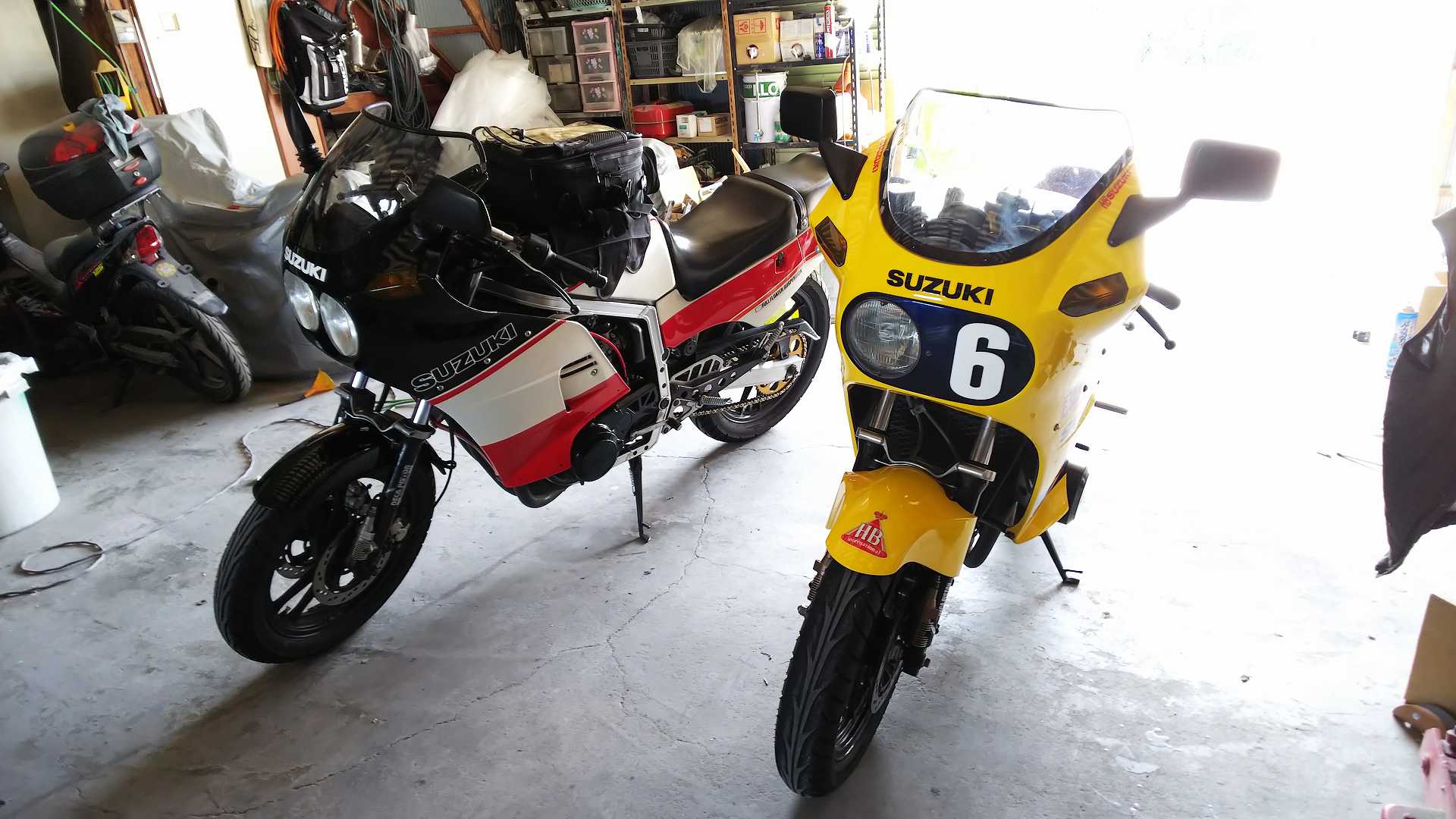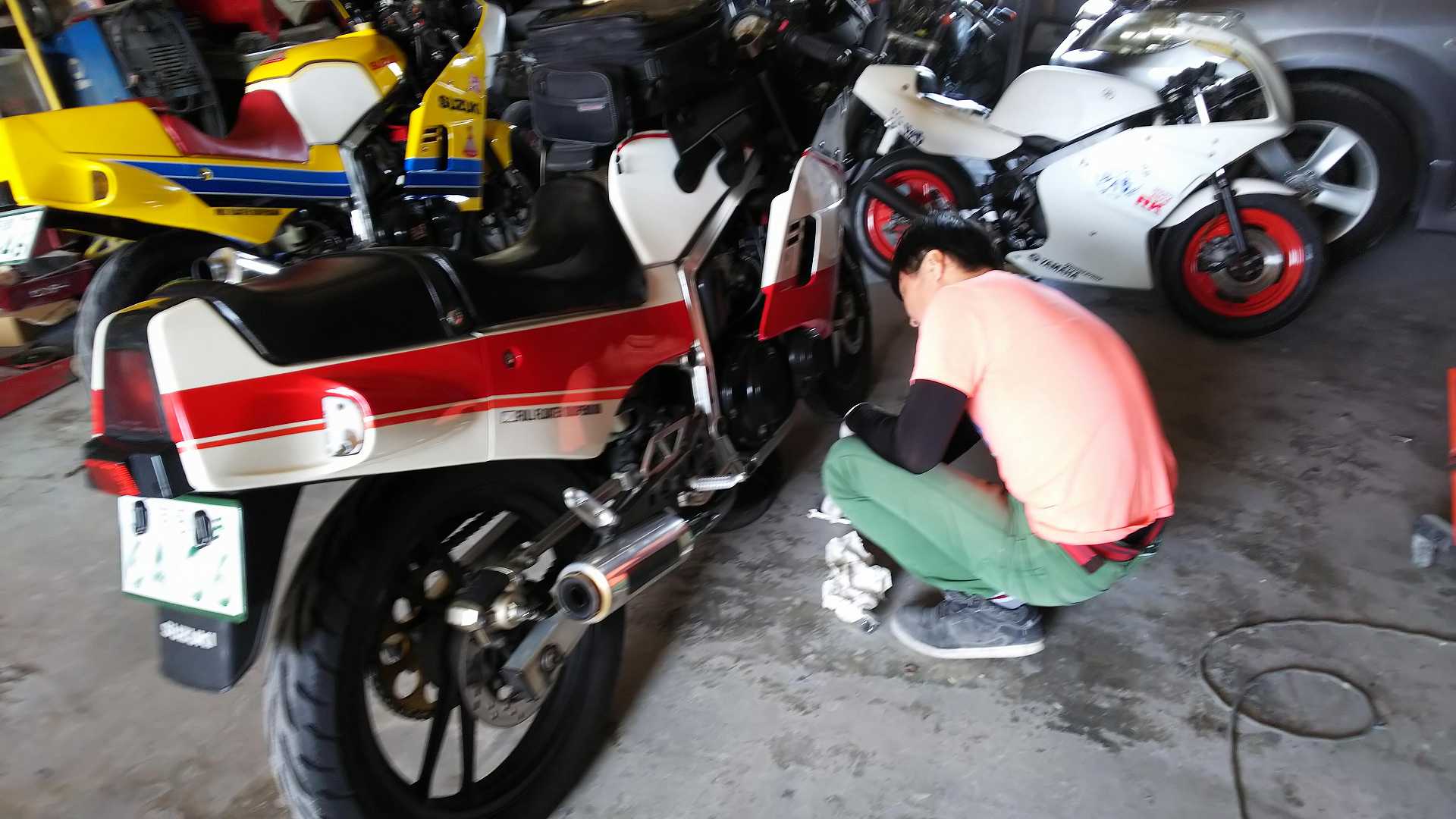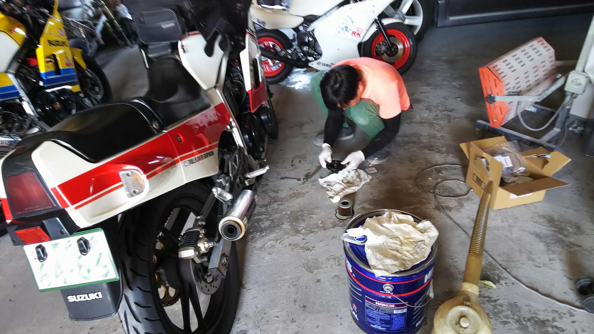 春のオイル交換まつり、赤白黒の後は、戻ってHBに! #80sMeeting #GK71B #GSXR @ ワタナベオートボデー