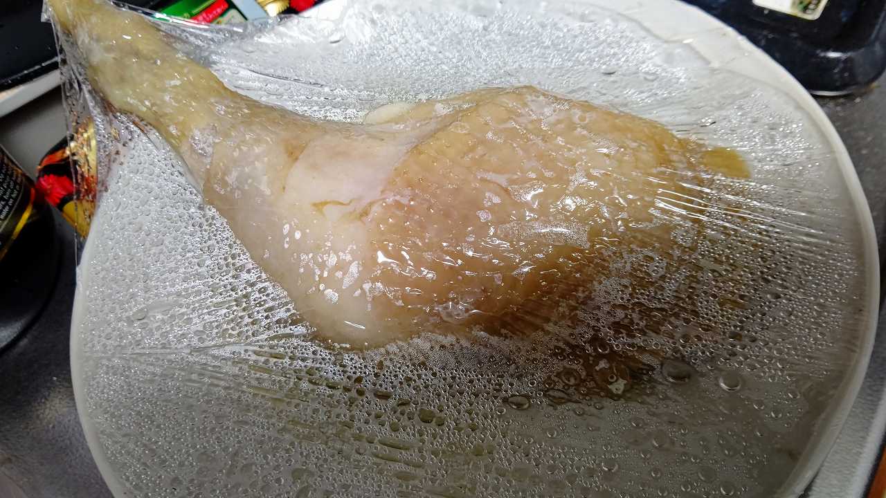ローストチキンは、ラップしてから、レンジでチンして、そのあとフライパンで