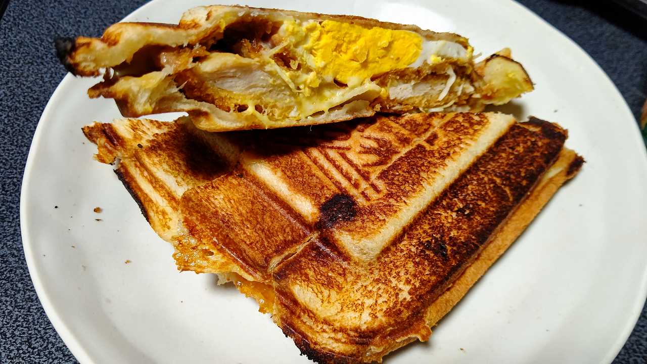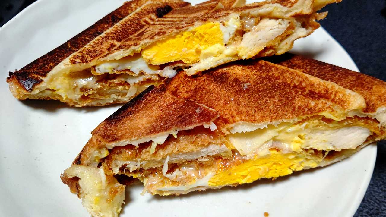 朝飯、ラ・ムーのカツと玉子のサンドの間に、目玉焼きを、チーズ四枚で挟んでみて