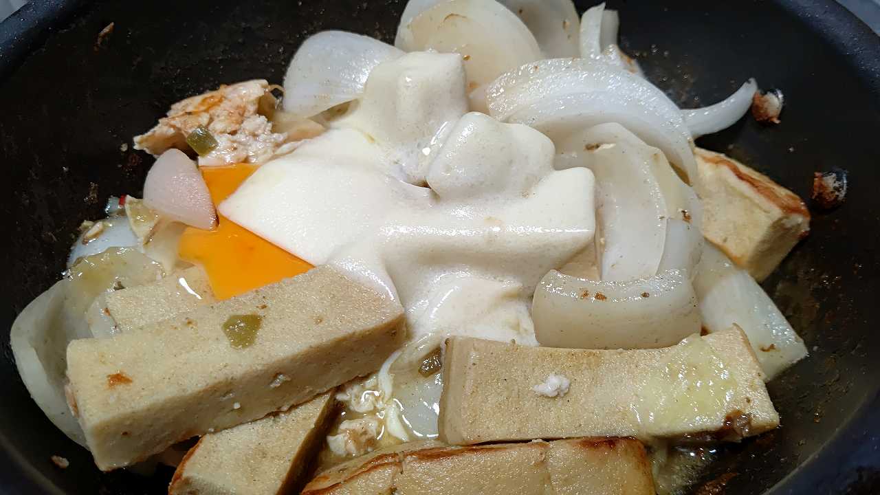 高野豆腐、新玉ねぎ、サラダチキン炒めて、タイカレーを。。。玉子とチーズ