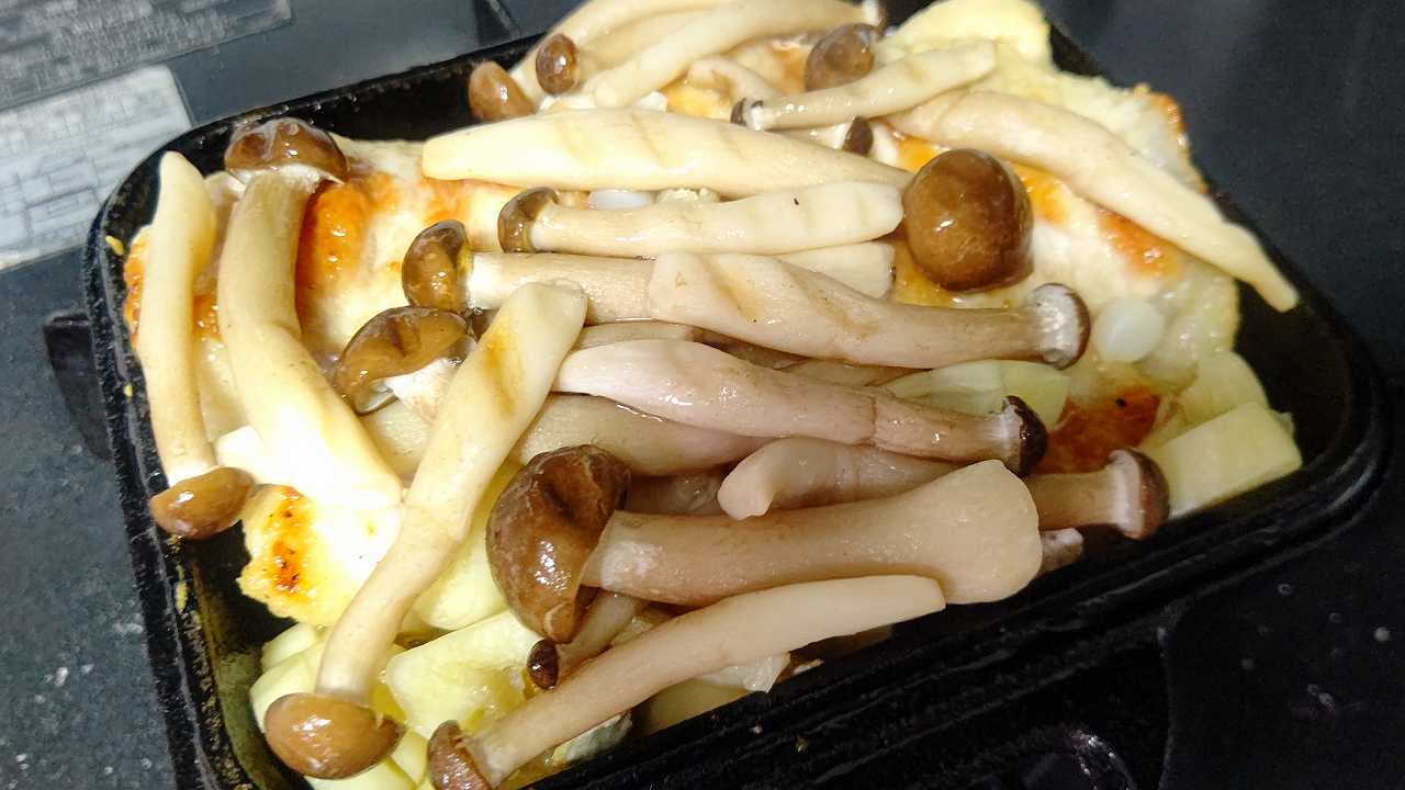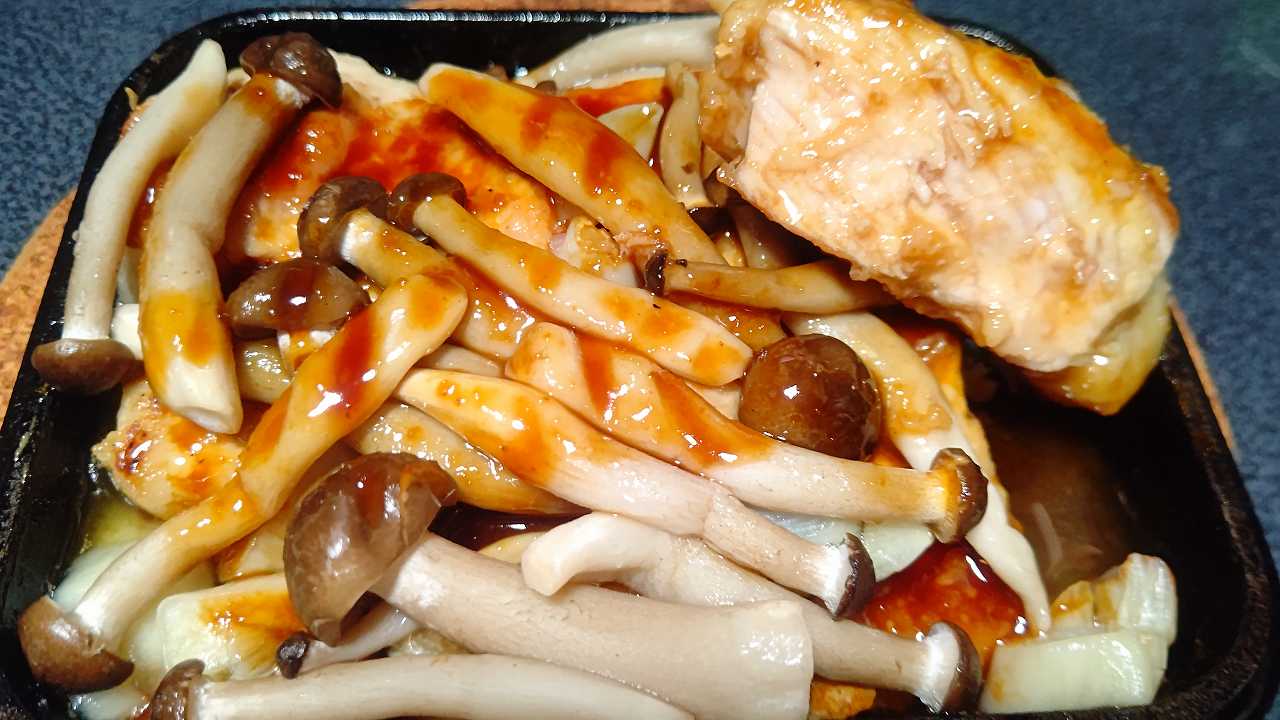 片面を焼き目つくほうで、強火で焼いて、ひっくり返して、ニンニクと、ぶなしめじ入れて、弱火で、だいぶ時間置いて