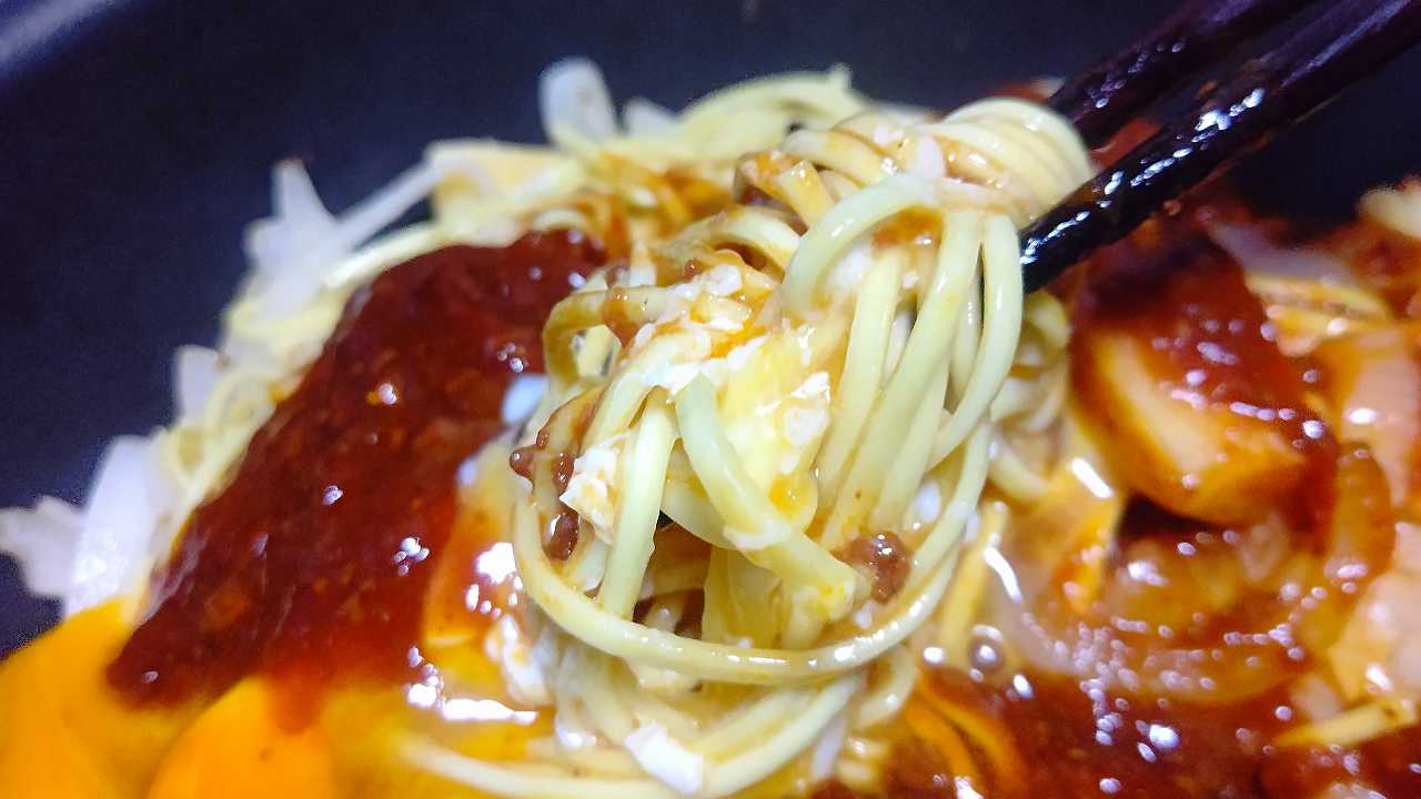 玉ねぎと炒めて、糖質50%パスタも入れて