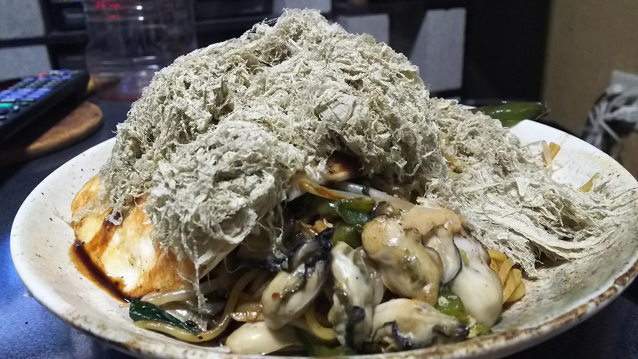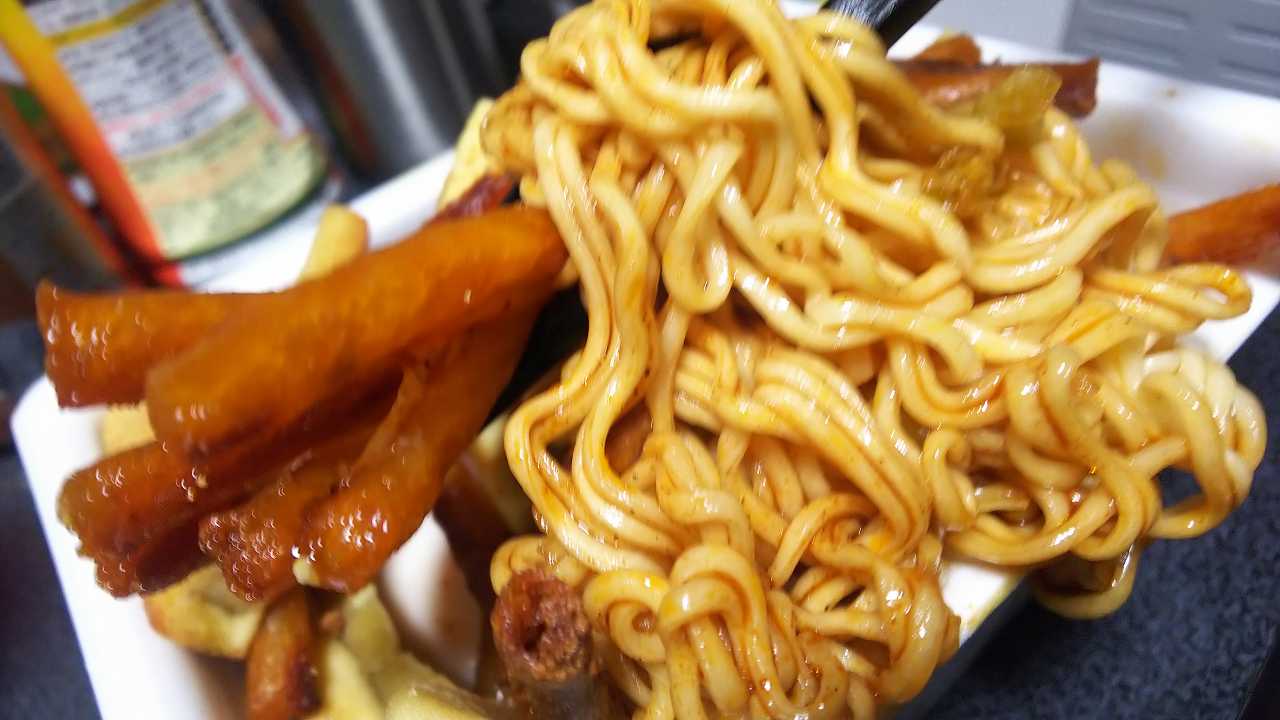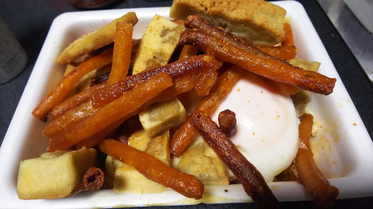 #ペヤング激辛MAXEND に、高野豆腐をオリーブ油で炒めて、#じゃがりこ激辛インドカレー味 を加えて、玉子入れて、お湯で蒸して、激辛四川ラー油でしびれされたのを乗せる。