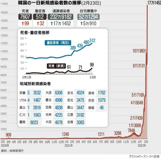 韓国の新型コロナウイルス一日新規感染者が23日午前0時時点で17万人を超えた。前日まで9万人台(22日、9万9444人)だった新規感染者が、たった一日で7万人以上(7万1827人)も急増したのだ。