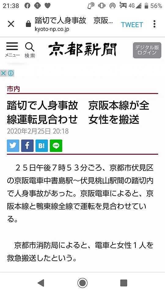 25日午後7時53分ごろ、京都市伏見区の京阪電車中書島駅~伏見桃山駅間の踏切内で人身事故があった。京阪電車によると、京阪本線と鴨東線全線で運転を見合わせている。