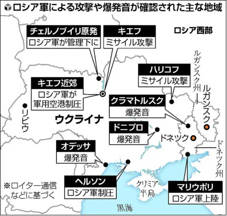 【モスクワ=田村雄、ワシントン=田島大志】ロシア国防省などによると、ウクライナへの侵攻を24日に開始したロシア軍は、南部ヘルソンや首都キエフ郊外の軍用の空港を制圧した。キエフ北方にあり1986年に史上最悪の放射能汚染事故を起こしたチェルノブイリ原発も管理下に置いた。ロシア軍は東部と北部、南部の3方向から侵攻し、重要施設の制圧などを進めている模様だ。