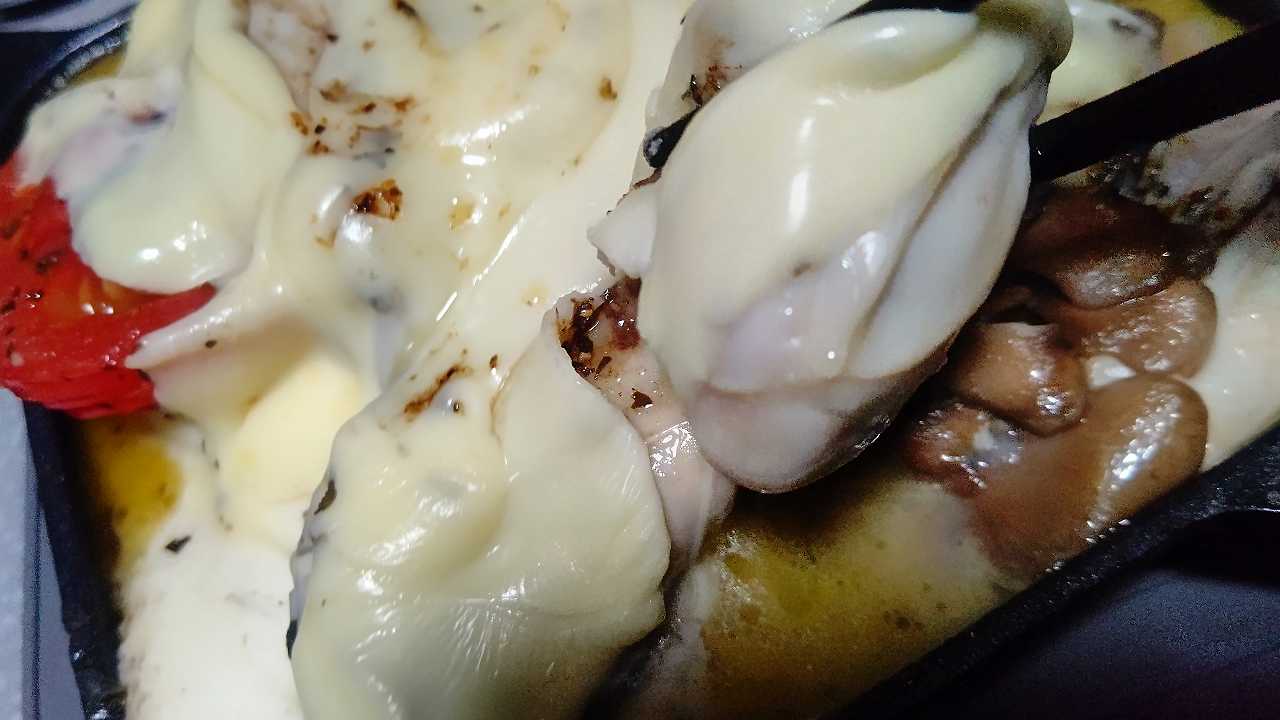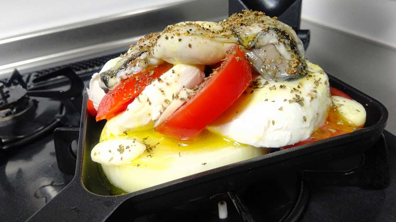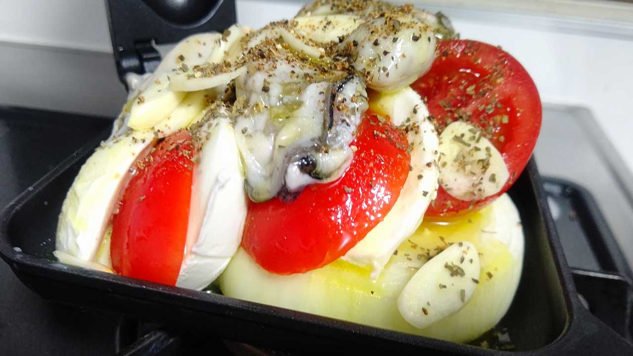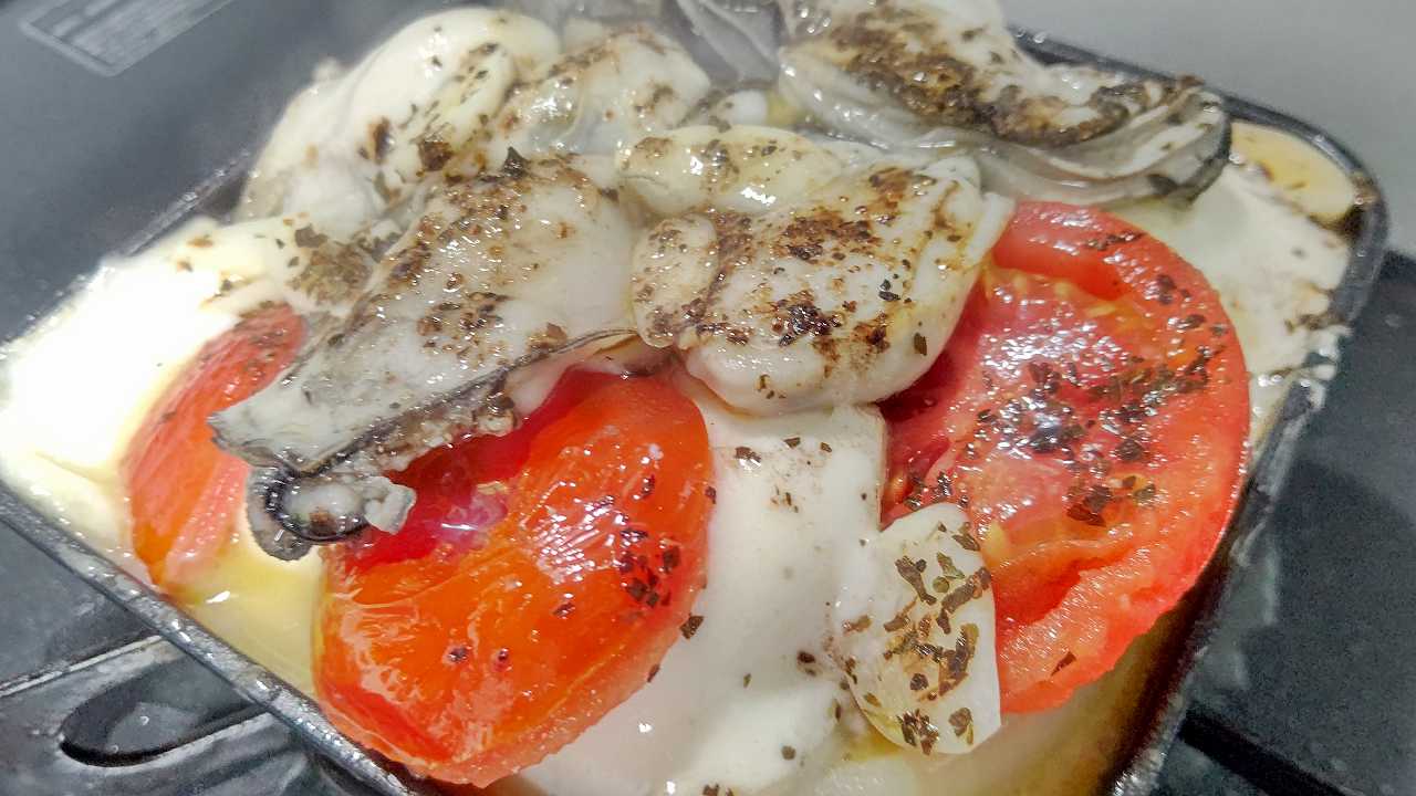 淡路島産玉葱と、舞茸、モッツァレラチーズとリコピントマト、広島産牡蠣1パック、ニンニクとオリーブオイル、マキシマムスパイス、バジル、3分焼いて、