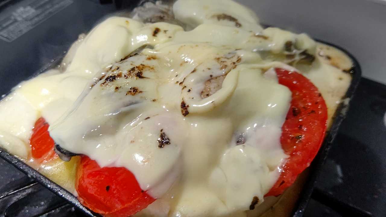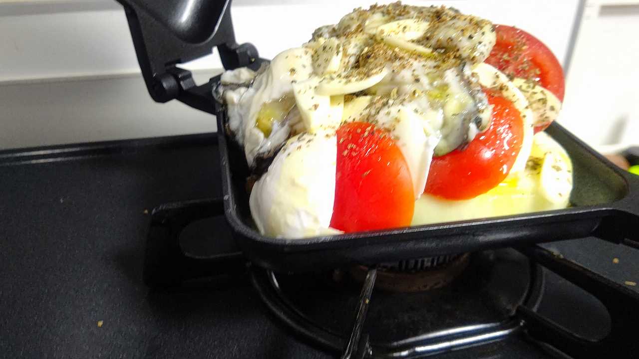 2022/02/24 和平フレイズ キャンプラス 折りたためるホットサンドメーカー で、淡路島産玉ねぎとモッツァレラチーズ、トマトのミンチ挟み 焼いてみた #我が家のわへい自慢