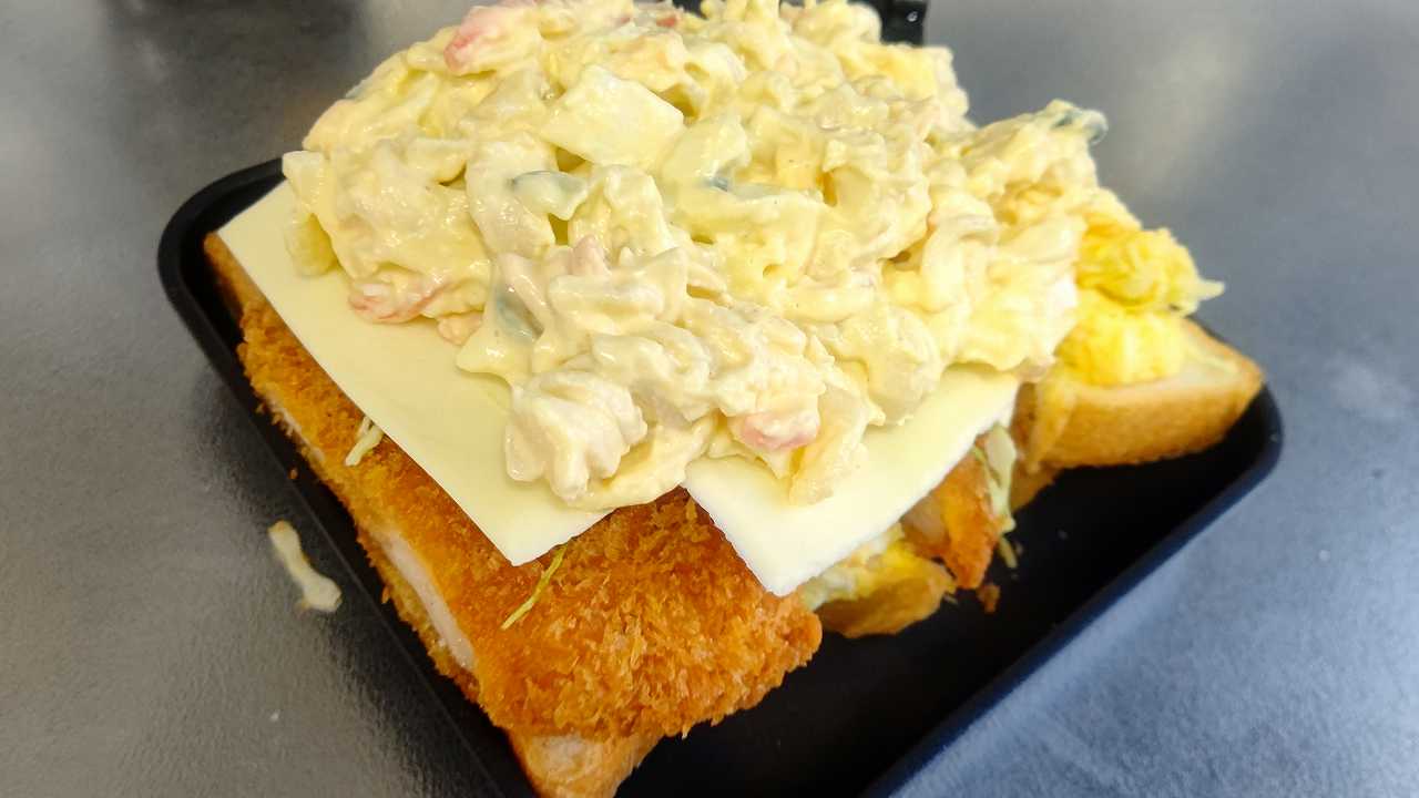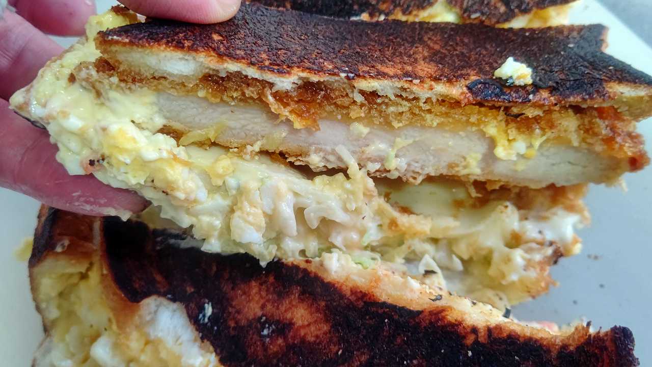 ラ・ムーのチキンカツと玉子のサンドに、玉子マカロニサラダととろけるチーズ挟んでやりました