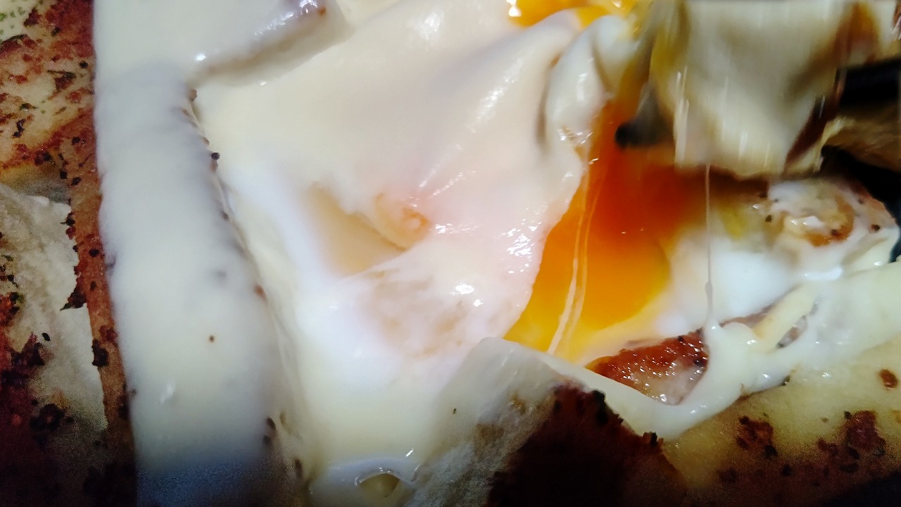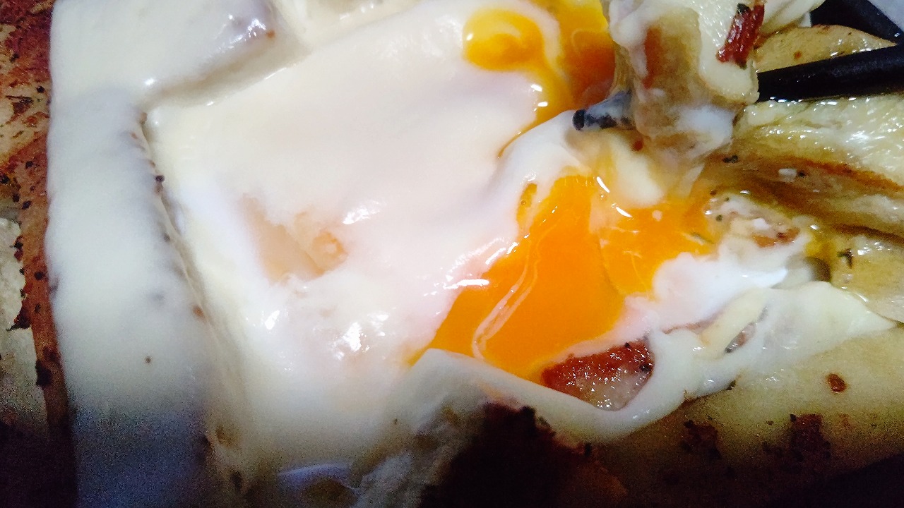 アヒージョオイルで、さらにニンニク入れて、高野豆腐にしみこませて焼いて、玉子ととろけるチーズでいただきました