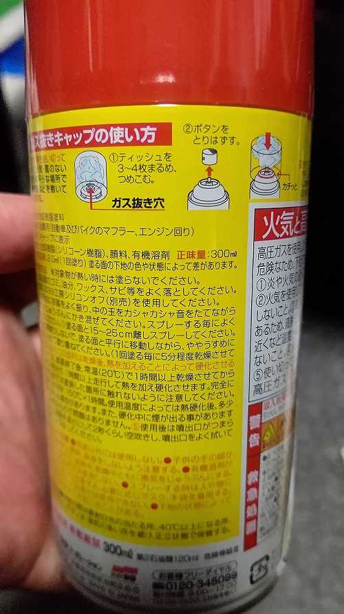 4.この塗料は乾燥後、熱を加えることによって硬化させるタイプ。塗装終了後、常温(20℃)で1時間以上乾燥させてからエンジンをかけ、1時間以上走行して熱を加え硬化させる。硬化が完了するまでは塗装した箇所に触れないように注意すること。