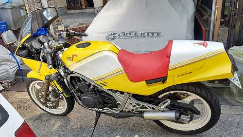 井上製作所の社長さんが、RG250ΓのWWがあるんだが、前に直そうとして、ウォーターポンプがダメと言われて、外装は、工場に吊ったままで、車体はあずけてある。。。