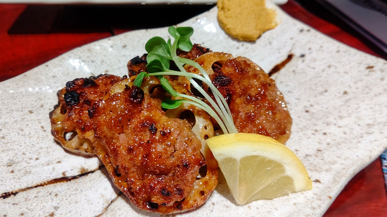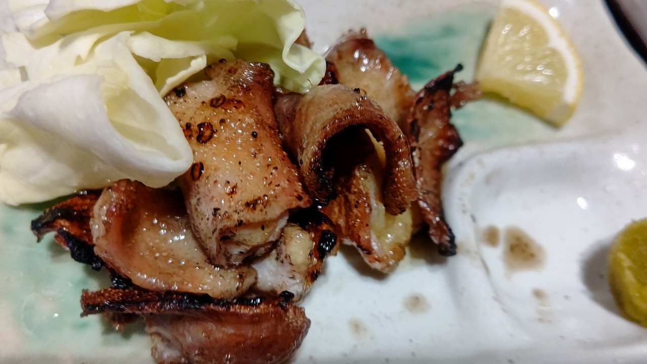 肉付きヤゲン炙り焼き 430円 これも、香ばしさと油がちょうどよくて、むちゃくちゃおいしい。焼き鳥は串焼きとバラ焼きあって、バラ焼きのほうがコスパ良いかな