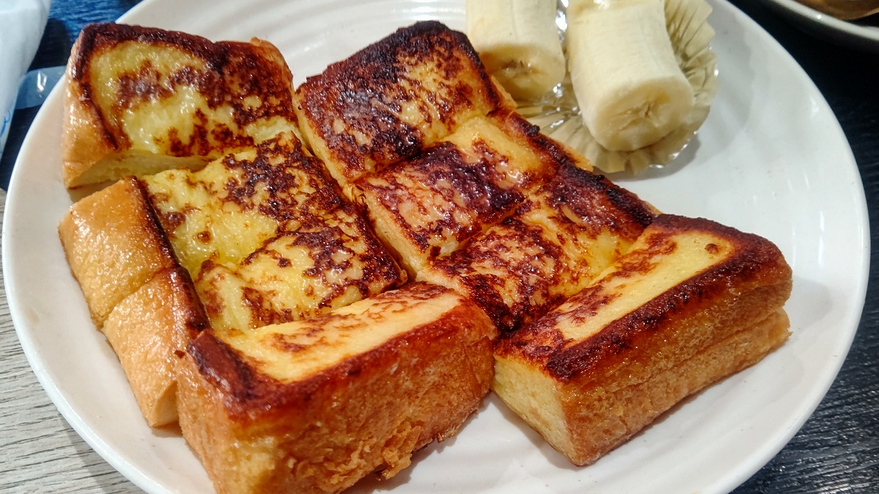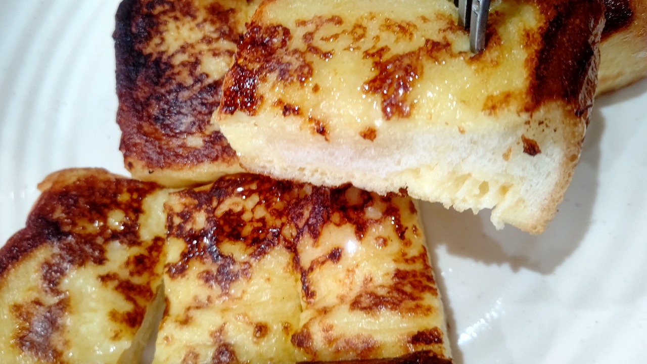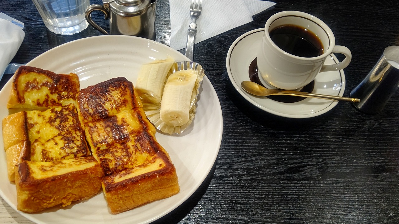 フレンチトーストは、甘さは抑えてあって、好みでシロップかけていただきます。