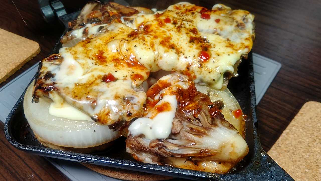 2022/03/29 和平フレイズ キャンプラス 折りたためるホットサンドメーカー で、チーズインハンバーグと舞茸、ミニトマト、玉ねぎ 焼いてみた #我が家のわへい自慢