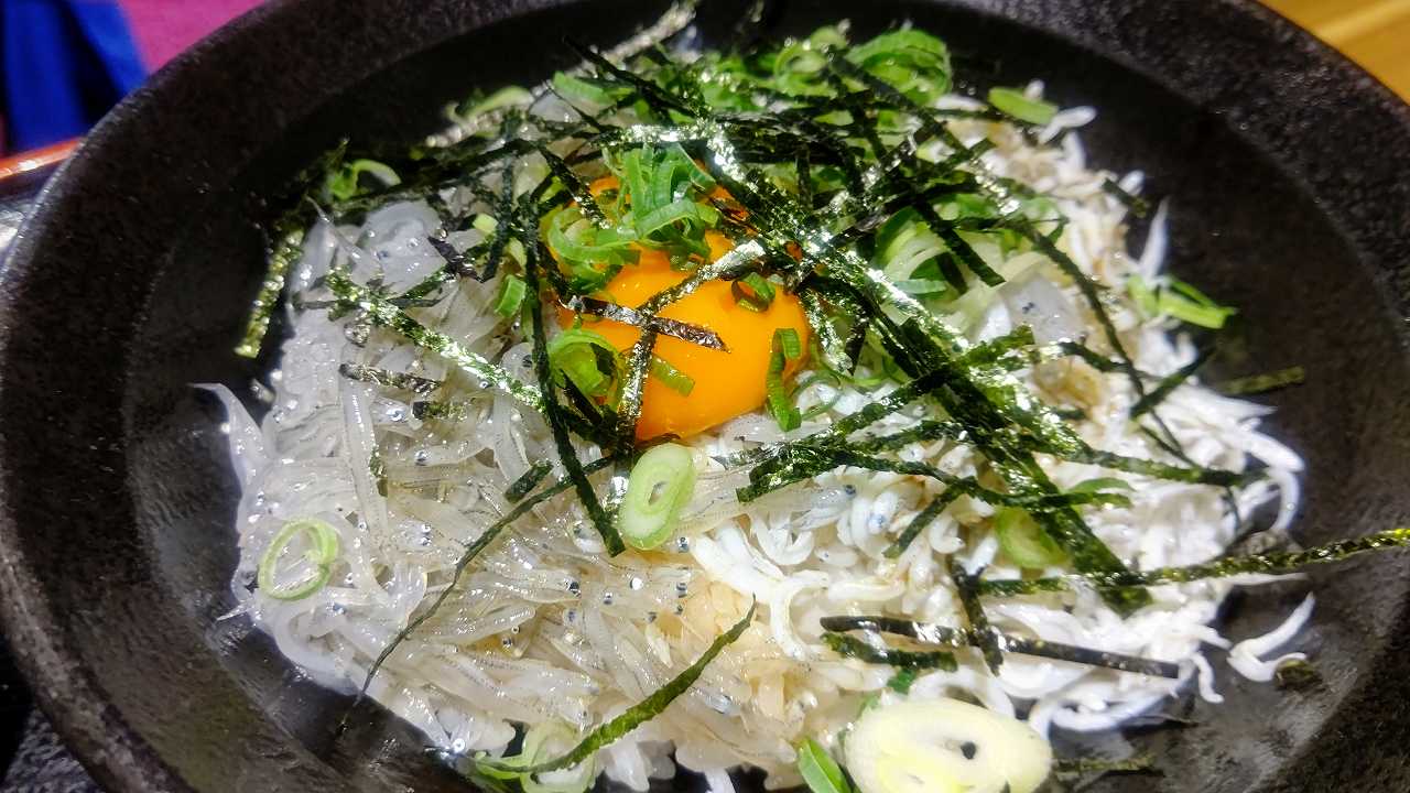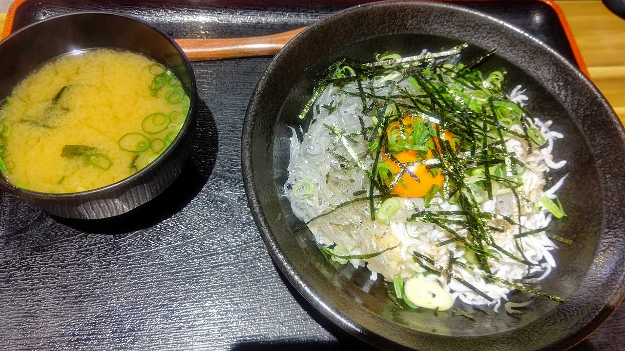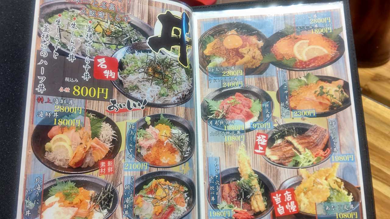 岸和田で、生シラス丼 800円と、活カンパチ造り 820円いただいてます。