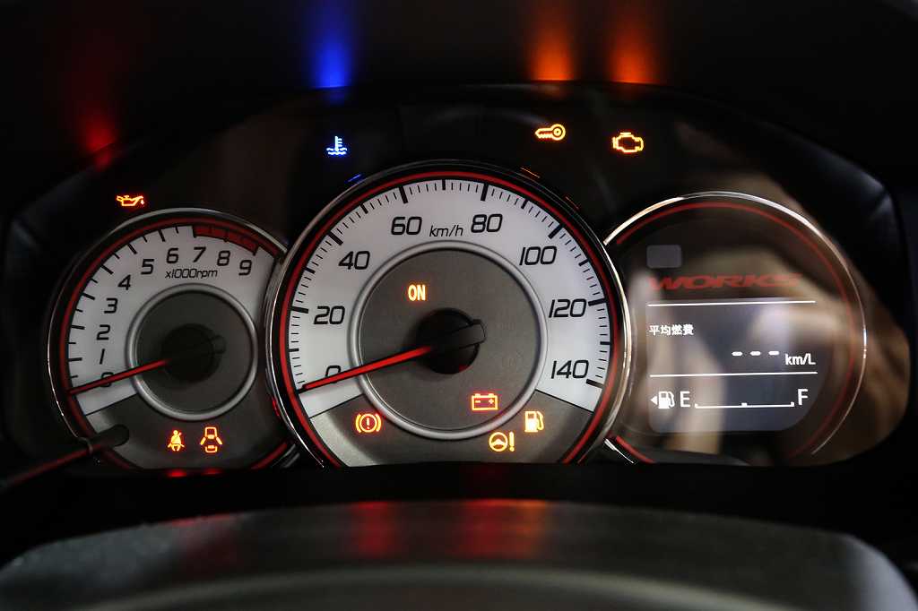 メーターにも「WORKS」のロゴが入る。タコメーターは7000rpmからレッドゾーン。目盛りは9000rpmまで刻まれている